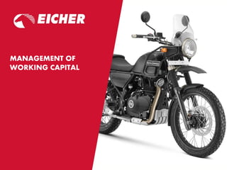 Eicher Motors, a significant player in India's automotive industry, focuses on expanding its market presence and enhancing production capacity, particularly in the mid-sized motorcycle segment. The company employs an aggressive working capital policy to optimize liquidity and reduce reliance on current assets while managing debt and credit efficiently. Key strategies include improving supplier relationships, inventory management, and cash flow optimization to adapt to growth and new product lines.