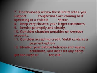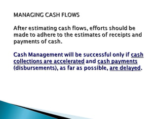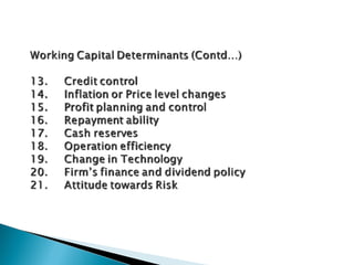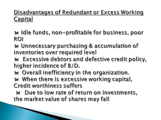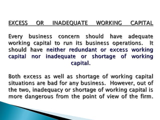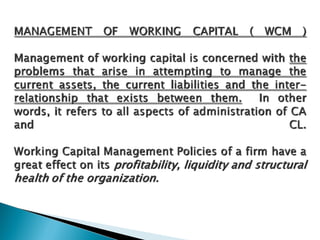 The document discusses the concept of working capital, which refers to a company's short-term assets and liabilities. It presents two definitions of working capital: the balance sheet concept, which is the excess of current assets over current liabilities, and the operating cycle concept, which refers to the time period between purchasing inventory and collecting cash from sales. The document outlines the key components of a company's operating cycle and how managing working capital, including inventory levels, accounts receivable, and accounts payable, can impact cash flows and the business.