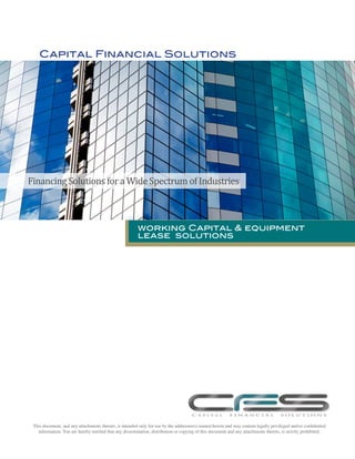 Capital Financial Solutions provides financing and leasing solutions for businesses. They offer equipment leasing, capital leases, operating leases, and working capital loans. Their working capital loans range from $10,000 to $150,000, can be used for various business expenses, and are approved within 24 hours with funds available within a week. Capital Financial Solutions works with businesses across various industries to provide flexible financing options.