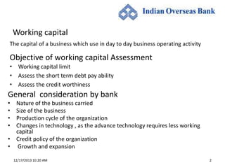 This document discusses methods for assessing working capital requirements. It outlines three common methods - maximum permissible bank finance, cash budget system, and turnover method. It also discusses general considerations like business nature, size, production cycle, and credit policy. Benchmark ratios for current, debt-equity, and debt service coverage are provided. The document emphasizes the importance of prime security, collateral security, and insurance when obtaining working capital financing.
