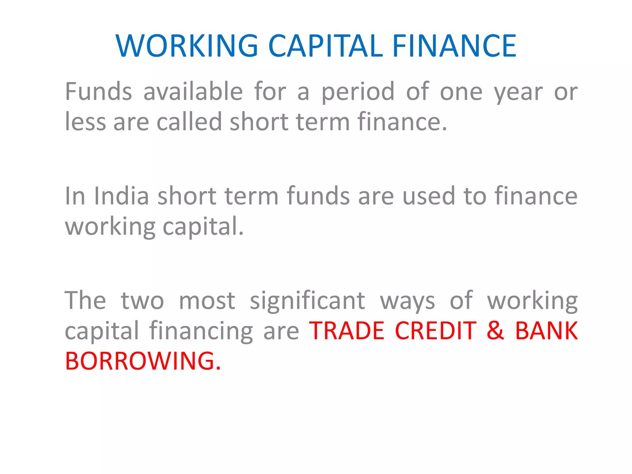This document discusses sources of working capital finance in India, focusing on trade credit and bank borrowing. It provides details on trade credit terms, benefits, and factors to consider in deciding whether to take a discount or pay later. For bank borrowing, it outlines forms of financing like overdrafts and cash credits, as well as security requirements and regulations on financing based on recommendations from the Tandon and Chore Committees to the Reserve Bank of India.