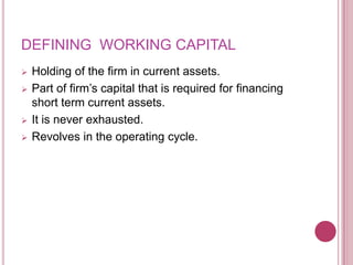 The document defines working capital as the capital required to finance short-term operating needs like current assets. It discusses the different types of working capital including gross and net working capital. It also covers key concepts related to working capital management such as operating cycle, determinants of working capital needs, and approaches to financing current assets using long-term vs short-term sources of funds.