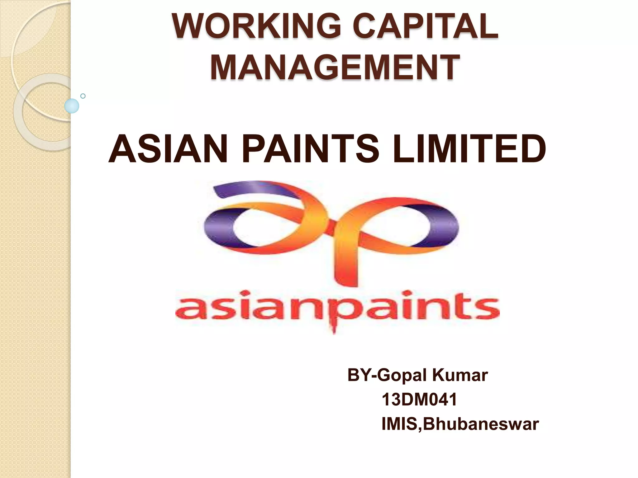 Asian Paints Limited is India's largest paint company based in Mumbai. The document analyzes Asian Paints' working capital management and profitability ratios from 2009 to 2013. It finds that while the company's sales have increased, it has been able to manage its daily operations with decreasing working capital. Asian Paints has maintained strong liquidity and profitability ratios over this period, demonstrating efficient working capital management despite sales growth.