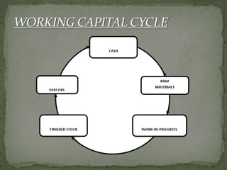 Working capital refers to a company's current assets and current liabilities. It represents the funds available for day-to-day operations, including purchasing raw materials and paying wages. Positive working capital ensures a firm can continue operations and meet short-term debts and expenses as they become due. The management of working capital involves managing inventory, receivables, payables, and cash. It is important for operational efficiency, securing credit, cash flow management, and maintaining liquidity and solvency. Both too much and too little working capital can negatively impact a business.