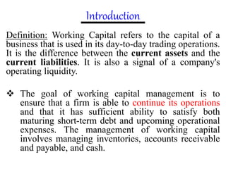- Definitions of working capital and its key components like cash, receivables, inventory, and payables.