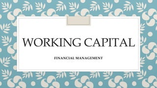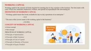 Working capital refers to the funds used to meet daily business expenses. It includes current assets like cash and inventory needed to operate on a day-to-day basis. Proper management of working capital, accounts receivable, accounts payable and inventory is important for business liquidity and efficiency. Techniques to manage inventory include determining optimal stock levels, ABC analysis of inventory items and just-in-time systems. Sources of working capital include both long-term sources like equity and loans as well as short-term sources like trade credit, commercial paper and bank finance.