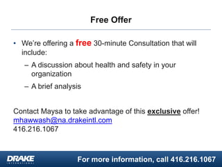 This document summarizes a webinar about working in extreme temperatures. It provides information on environmental factors that contribute to extreme heat and cold, related hazards, injuries and illnesses, and methods for prevention and control. The webinar discusses topics like heat stress disorders, cold stress disorders, protective clothing, training, and monitoring programs. It also advertises an upcoming webinar and offers a free consultation on health and safety.