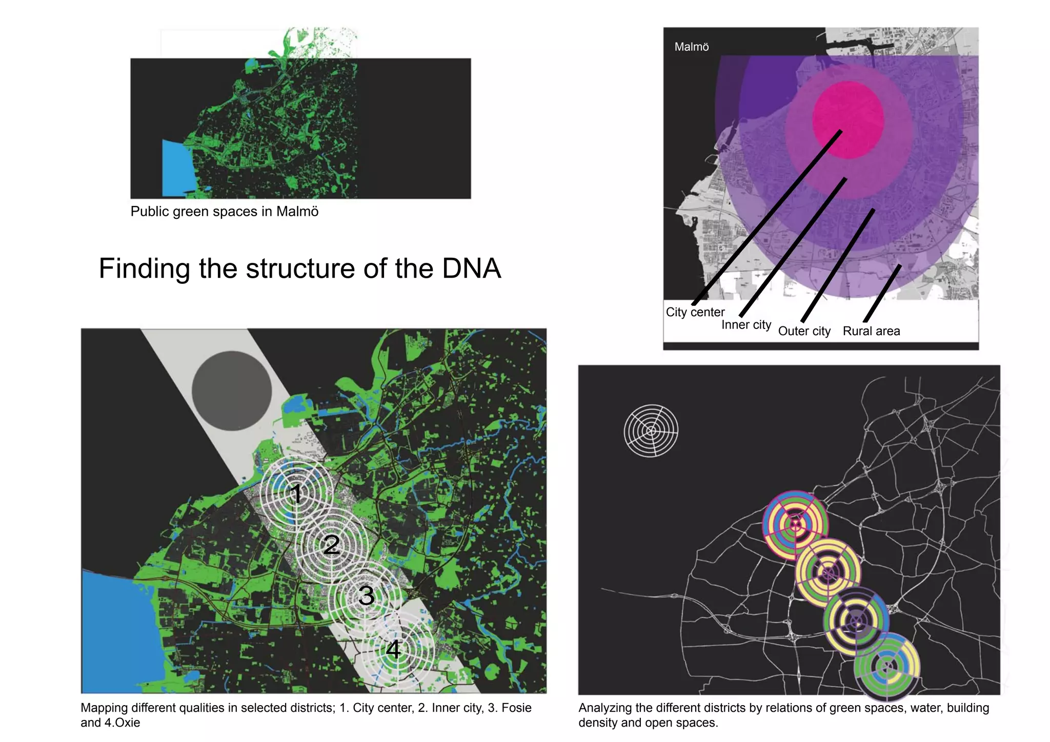 Malmö has high density and green space in the city center but less green space and higher density in the inner city, and even less density and green space in the outer neighborhoods of Fosie and Oxie. As the city densifies the outer areas, it needs to increase compactness and green space to maintain livability. A case study looks at transforming the landscape around Malmö through more sustainable agriculture, local products, and elastic systems that connect people and places. The goal is flexible, ambiguous landscapes rather than strict geometry, with fields within fields and ground and surface lifted together.