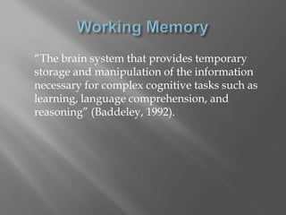 This document summarizes key aspects of working memory. It defines working memory as the system that provides temporary storage and manipulation of information for complex cognitive tasks. The central executive controls attention and monitors thinking/memory processes. There are two storage systems - the visuospatial sketchpad handles visual information and the phonological loop rehearses verbal information. Research indicates people can process around 7 units of information at once, though this varies by task. The modal model proposes separate auditory and visual processing pathways to help "stretch" working memory capacity.