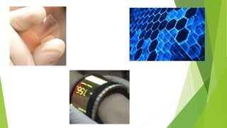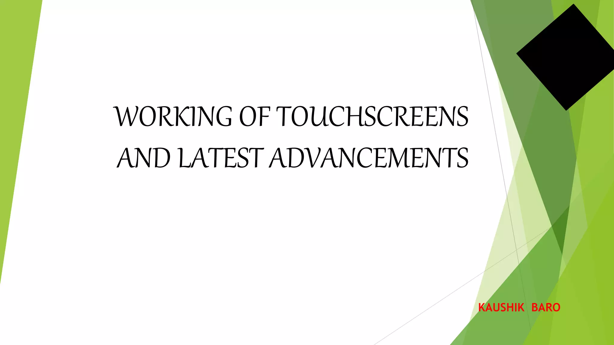 This document discusses different types of touchscreen technologies and recent advancements. It describes four main types: resistive, capacitive, infrared, and surface acoustic wave. Capacitive touchscreens using indium tin oxide electrodes are now most common due to low cost and good image quality, but ITO is becoming expensive and brittle. Graphene has potential to replace ITO as it is more flexible and durable, but mass production of graphene for touchscreens remains challenging due to the difficulties of growing defect-free graphene sheets and transferring them to device substrates.