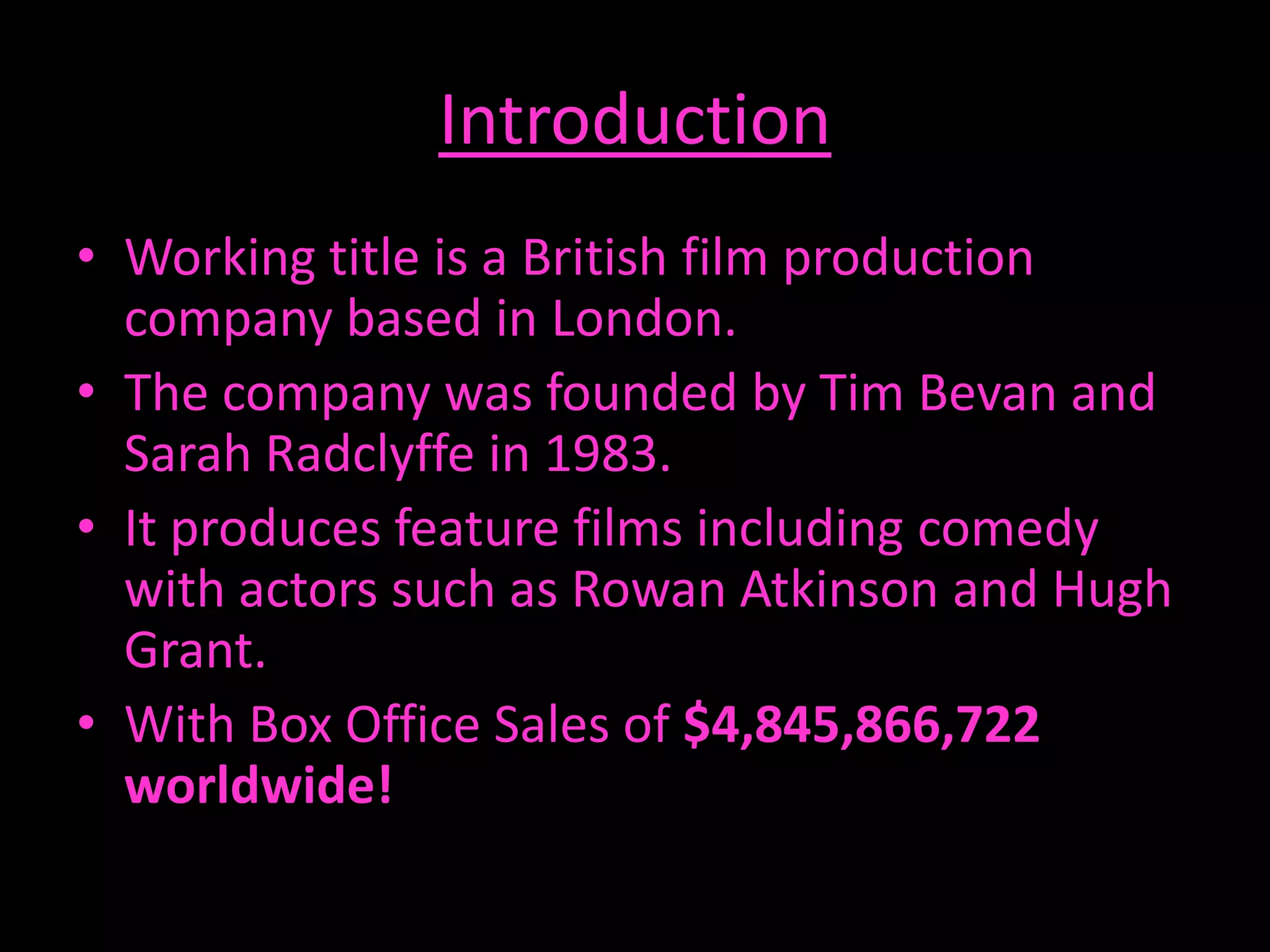 Working Title is a British film production company founded in 1983 by Tim Bevan and Sarah Radclyffe. It produces comedies starring actors like Rowan Atkinson and Hugh Grant. Working Title has survived in the American film industry due to its parent companies NBC Universal and Universal Studios, which provide funding, and its internet service provider owner Comcast, which allows for promotion. An example of one of its successful films is 2011's Johnny English Reborn, which had a $45 million budget and grossed $160 million worldwide.
