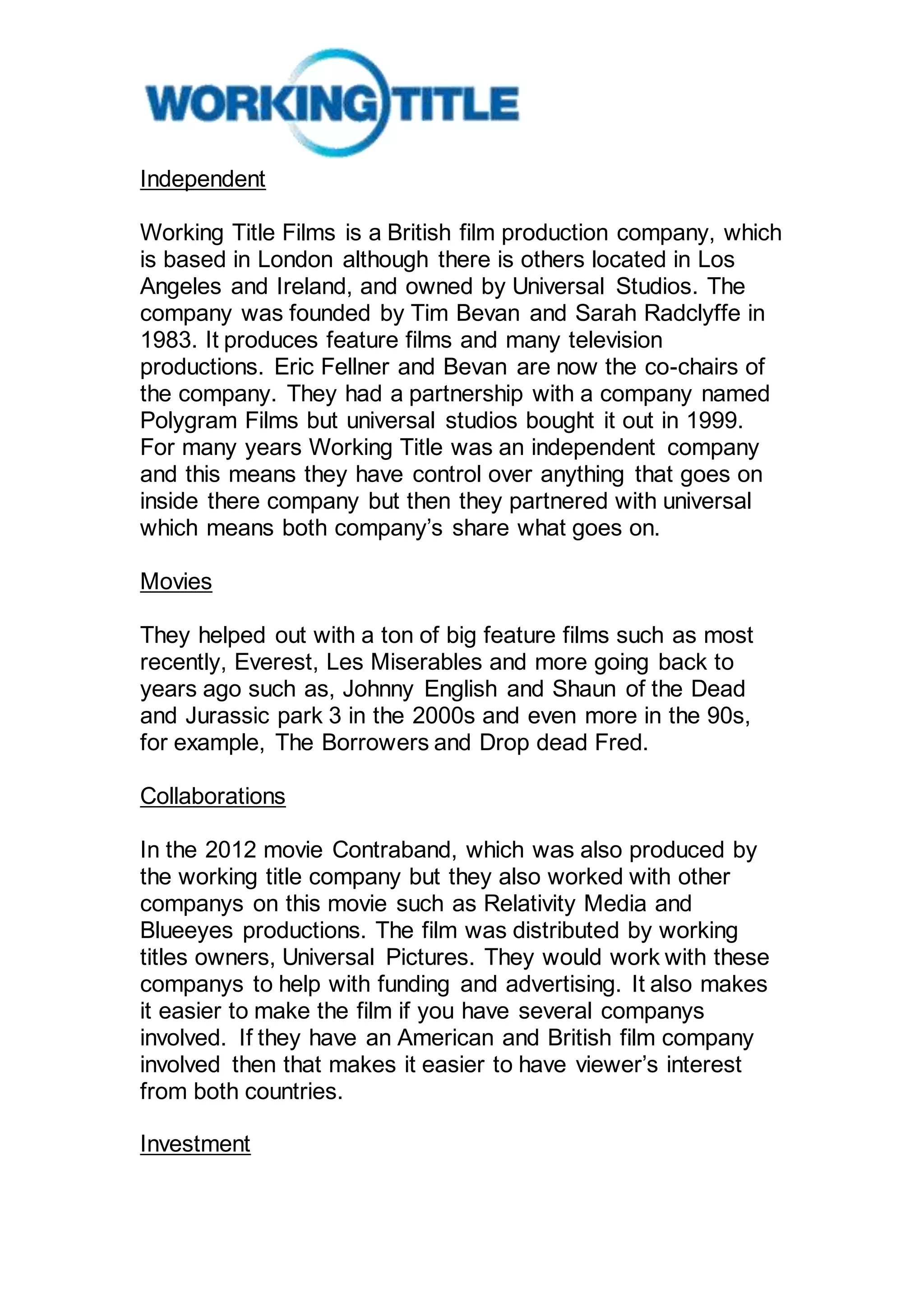 Working Title Films is a British film production company founded in 1983 by Tim Bevan and Sarah Radclyffe and based in London. It produces both feature films and television productions. Eric Fellner and Bevan now co-chair the company, which was originally independent but now partners with Universal Studios. Working Title has produced many major films from the 1990s to present like Everest, Les Miserables, Johnny English, Shaun of the Dead, and the Jurassic Park franchise. The company frequently collaborates with other studios on films for funding, advertising, and appealing to international audiences. Non-profit organizations also invest in Working Title to support filmmaking without expecting financial returns, while corporations and wealthy individuals invest seeking profits