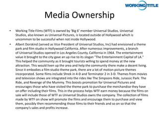 Working Title Films (WTF) is owned by Universal Studios, which helps promote WTF's films through its theme park and various media platforms. Universal Studios uses cross-promotion between its subsidiaries and convergence across different media to reach large audiences. Technological advances have both helped and harmed independent film studios like WTF by providing new distribution methods but also enabling piracy.