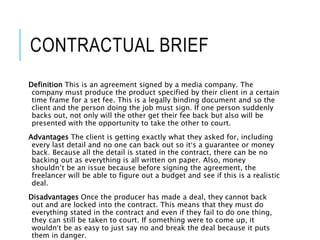 The document discusses different types of client briefs that can be used for media production projects. It defines contractual, formal, informal, co-operative, negotiated, commission, tender, competition, and my briefs. For each type of brief it provides the definition, advantages, and disadvantages. The key information is that different brief structures offer varying levels of flexibility, legally binding agreements, creative freedom for producers, and protection for clients and producers. The document also provides an example of how the writer would structure their brief for a project with a close family member as the client.