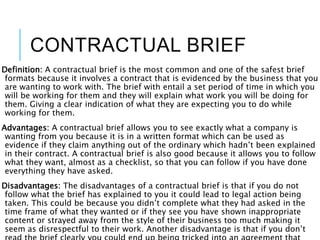 A contractual brief involves a written contract between a company and worker that specifies the work to be done, timeline, and expectations. It provides clear guidelines and evidence if issues arise. However, it could result in legal action if the brief is not followed. A formal brief outlines the work but lacks legal binding on payment, timeline, etc. so disputes could occur. An informal brief involves only a verbal agreement with no evidence of terms, allowing loopholes. Co-operative, negotiated, and commission briefs involve multiple companies collaborating on a brief, providing experience but requiring effective teamwork. A tender brief has companies submit proposals for a job, while a competition brief judges submitted work with a winner receiving payment.