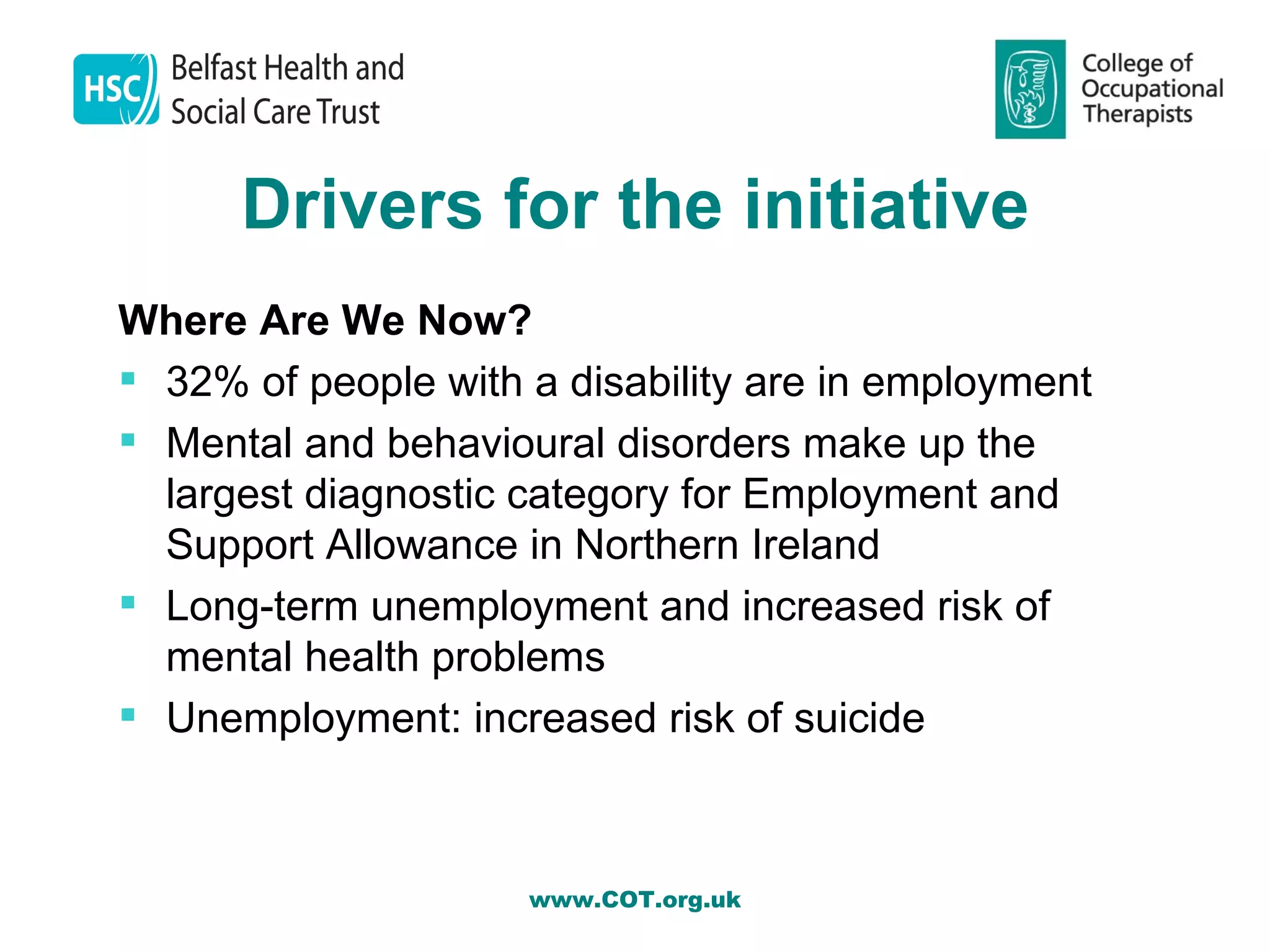 This document discusses occupational therapy initiatives to help people with disabilities and mental health issues find and maintain employment. It describes programs like Individual Placement Support that help people find competitive jobs and the Acute Care Job Clinic that assists those receiving mental health treatment to retain their current jobs. The document also discusses the benefits of work for recovery and presents case studies of individuals who found employment through these programs.