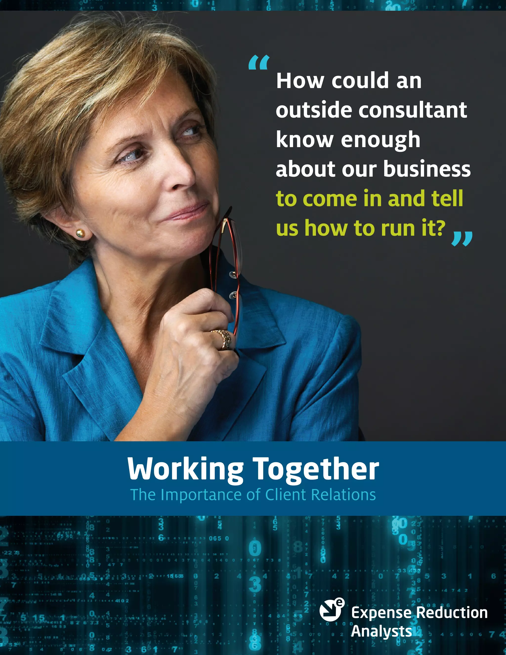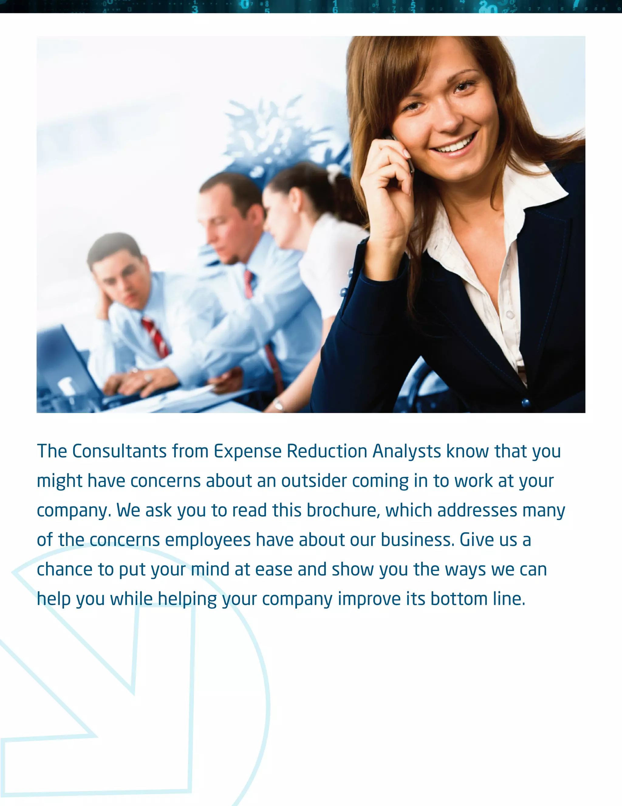 An outside consultant from Expense Reduction Analysts understands a business through thorough investigation and industry expertise. They analyze expenses like contracts and invoices to find savings opportunities across categories. Consultants implement recommendations and monitor results for 18-24 months to ensure savings. Their experience with over 14,000 projects provides data to negotiate effectively with suppliers on a business's behalf.