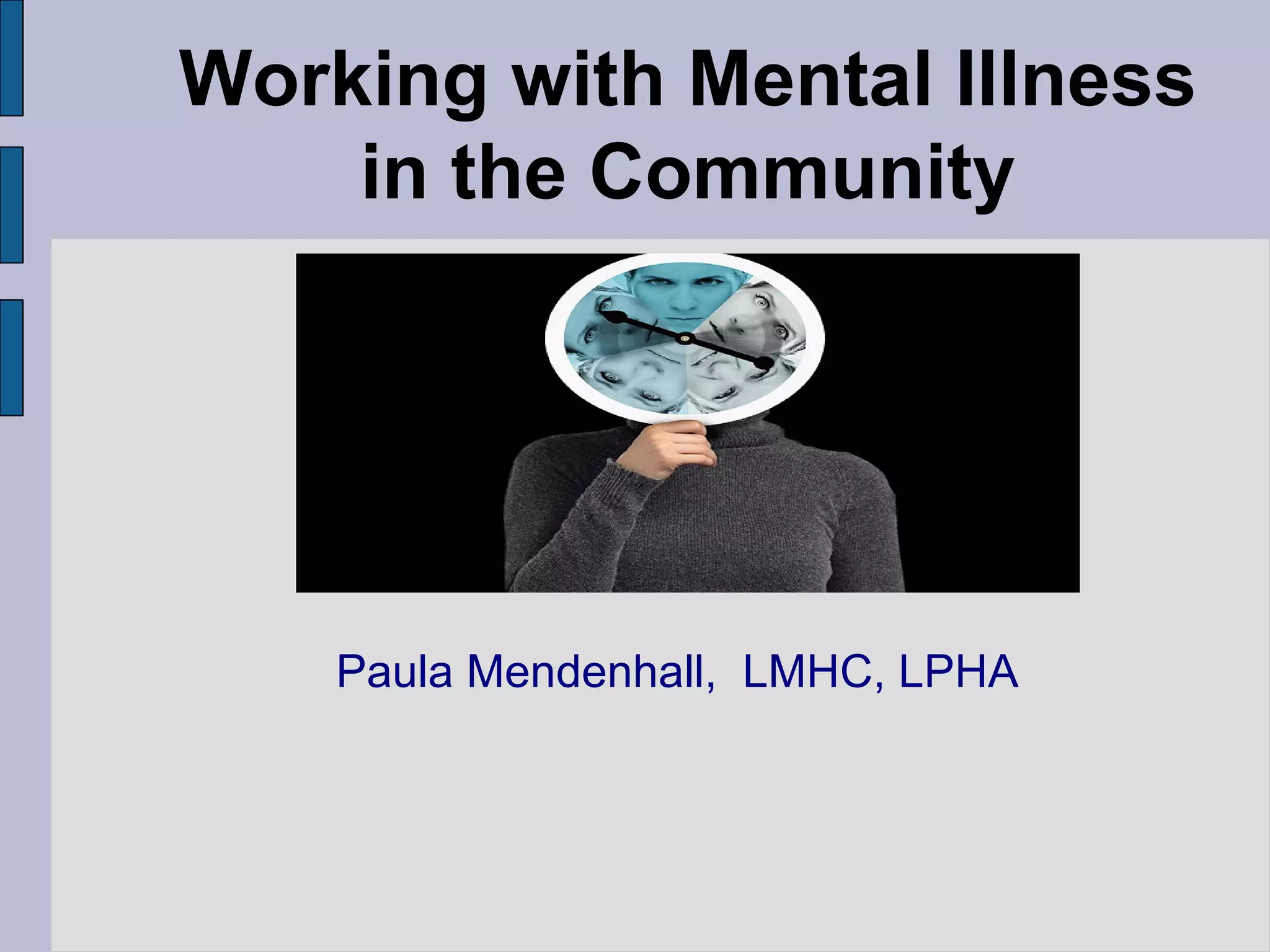The document discusses strategies for interacting with individuals experiencing mental illnesses like borderline personality disorder (BPD), post-traumatic stress disorder (PTSD), and schizoaffective disorder. It provides an overview of the characteristics and behaviors associated with each condition. It also offers tips for maintaining safety, such as communicating calmly, showing compassion, and addressing feelings of fear. Resources for crisis intervention and treatment are also mentioned.