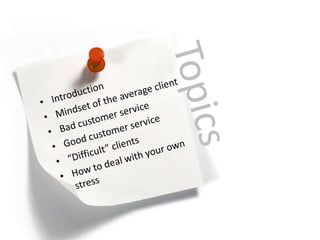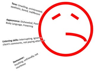 Working with clients, especially those new to technology, requires strong communication skills to bridge the gap in technical knowledge. It is important to establish control of the consulting encounter through a friendly and helpful demeanor while following a controlled sequence to resolve issues. Even with difficult customers, sticking to good customer service practices like listening, understanding their perspective, and asking for help when needed can help diffuse tensions and provide exceptional service.