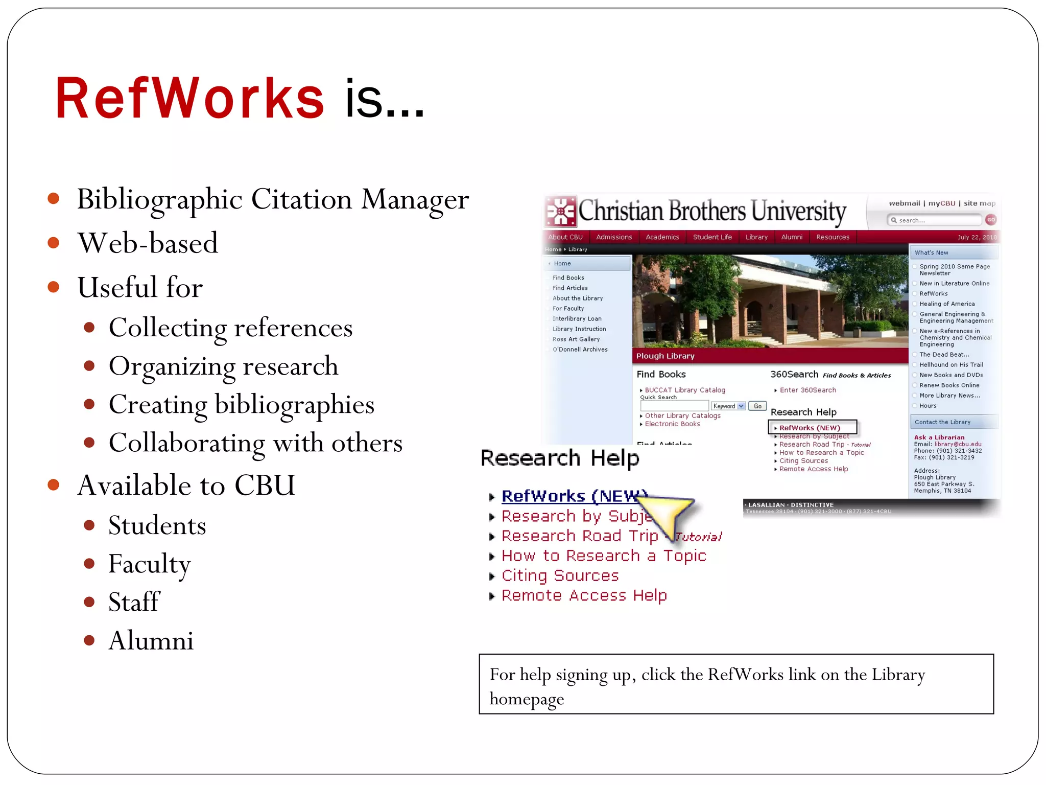 The document provides guidance on using RefWorks 2.0 at Christian Brothers University, specifically on managing folders for organizing references and creating bibliographies. It explains the significance of folders, creation steps, adding references, and conducting global edits for organized research. Additionally, it highlights the option to find and restore deleted references, and stresses the importance of avoiding duplicate entries in generated bibliographies.