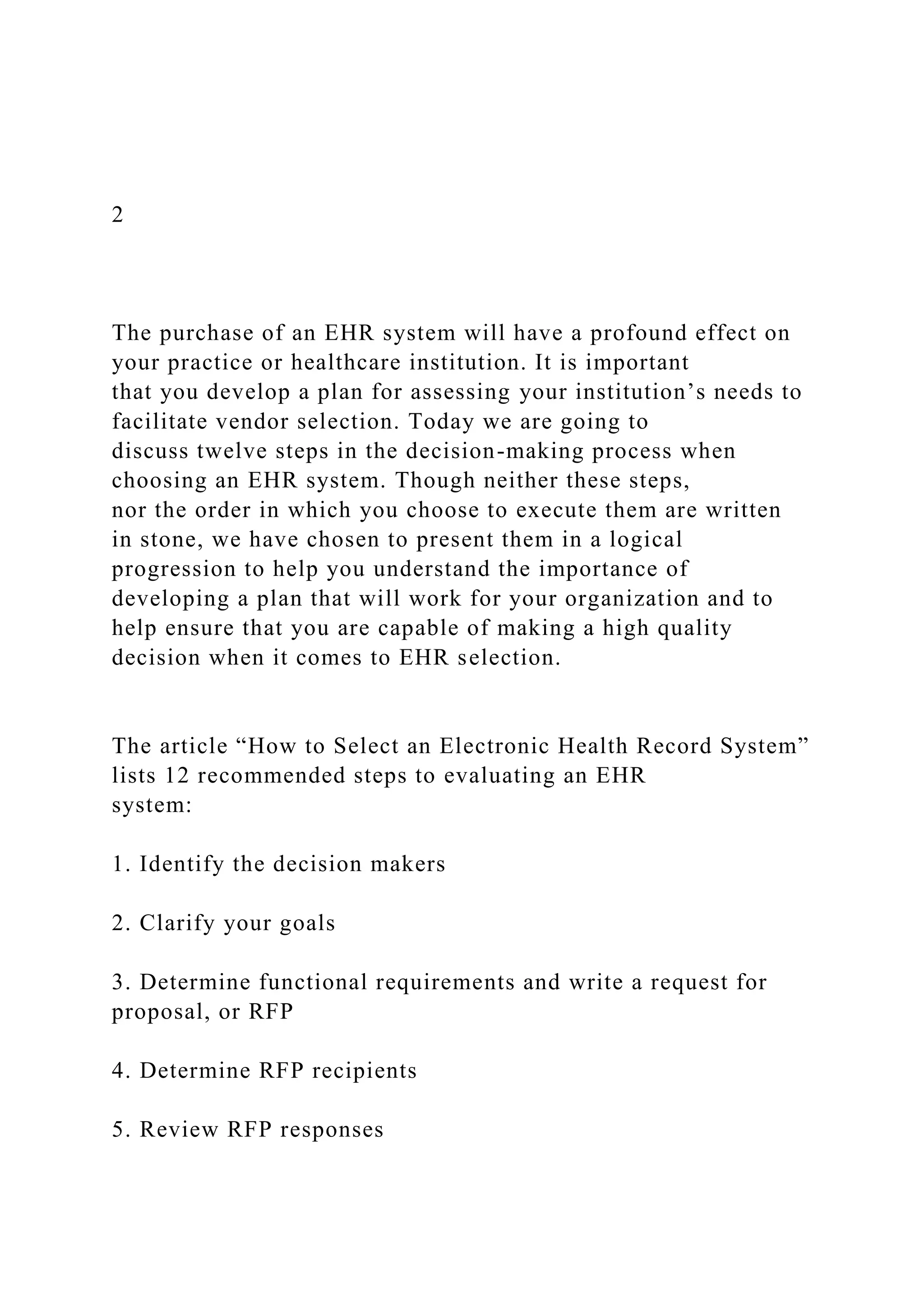 The document outlines the critical steps for selecting and installing electronic health record (EHR) systems, emphasizing the importance of thorough planning, stakeholder involvement, and clear functional and non-functional requirements. It provides a 12-step decision-making process for effective vendor selection, ranging from identifying decision-makers to negotiating contracts. The guide also includes insights into use cases, RFP creation, vendor evaluation, and integration considerations to ensure a successful EHR implementation.
