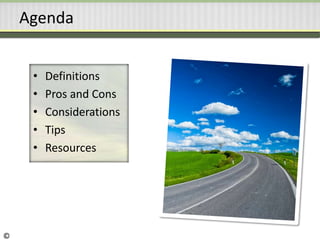 This document defines internal and external coaching and discusses considerations for using both in a coaching program. It provides pros and cons of internal versus external coaches, noting that companies are best served using a combination. Tips include training internal coaches externally, using internal coaches for entry-level through supervisor roles, and hiring external coaches for high potentials and higher levels. The document recommends measuring outcomes and empowering clients to choose coaches. It provides resources for further information.