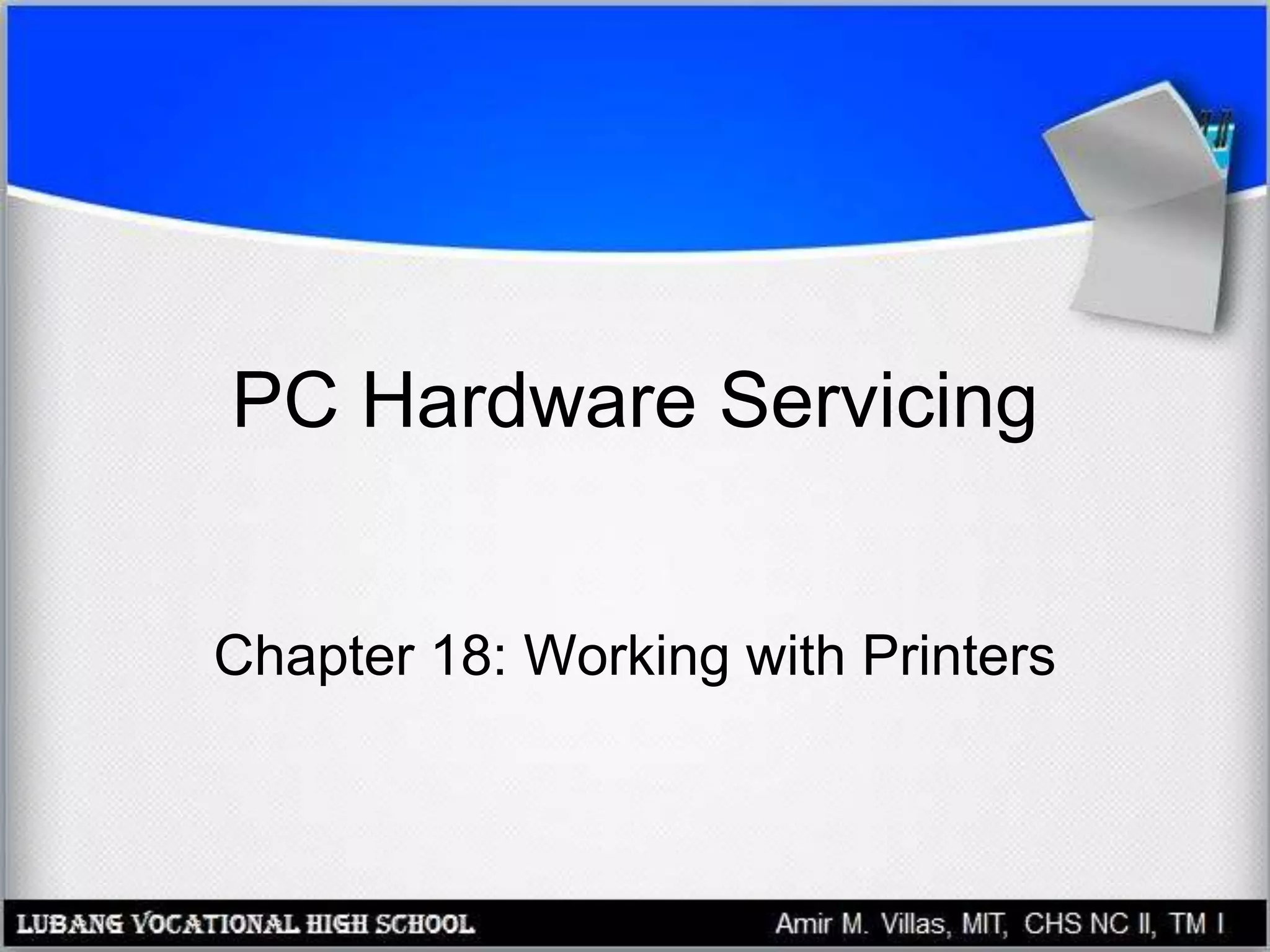 This document provides an overview of PC printer hardware, technologies, and troubleshooting. It discusses the basic functions of printers, different printer classes like line and page printers, and technologies such as laser, inkjet, dot matrix printers. It covers the laser printing process, installing and managing printer drivers, and evaluating factors like cost and print quality. The document also describes how to troubleshoot issues with print jobs, queues, and print quality.