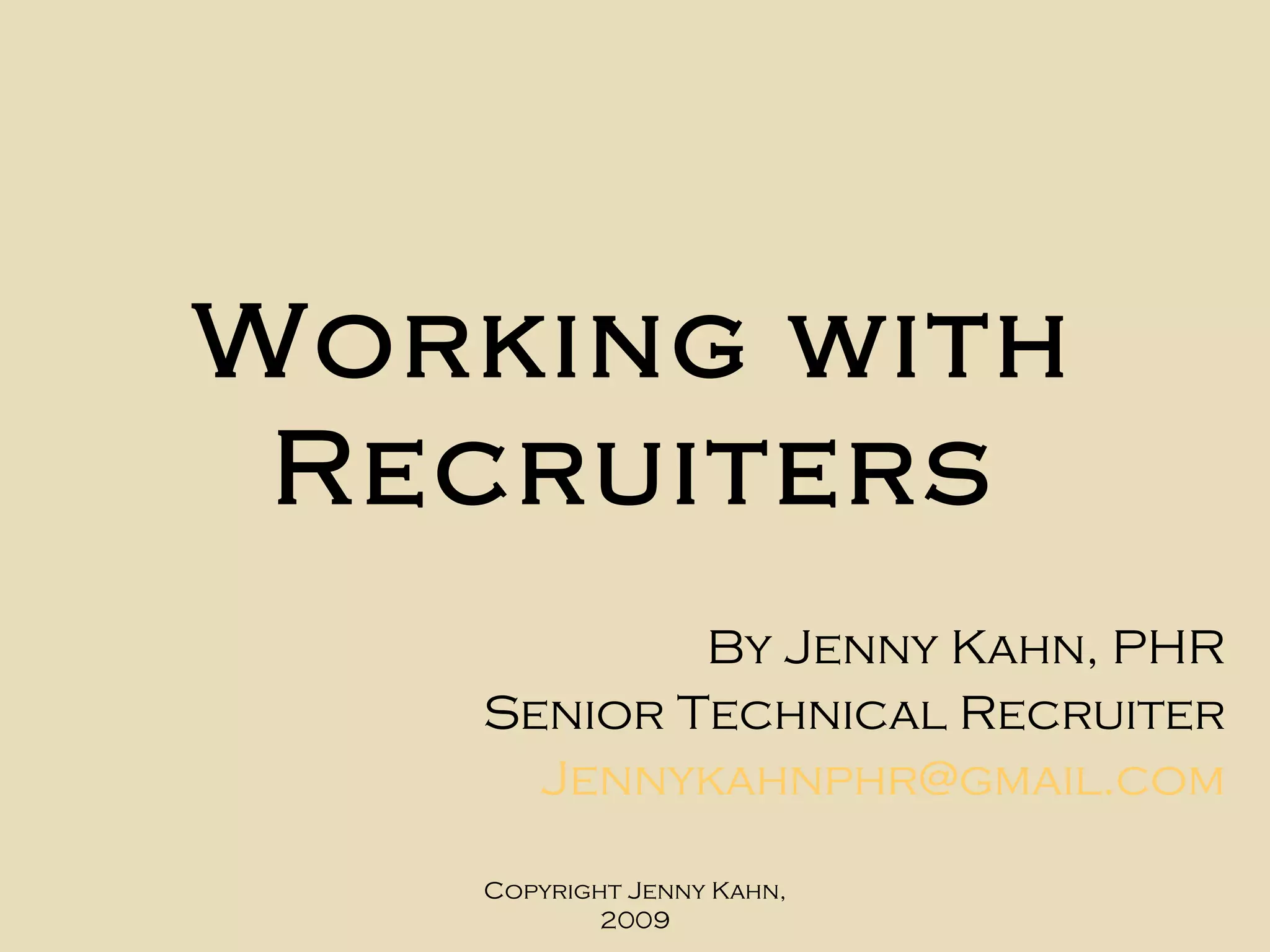 The document provides guidance on working with recruiters and search firms. It explains that recruiters can help candidates find jobs faster by providing industry contacts and preparing candidates. It describes different types of recruiters like in-house, contingency, and retained recruiters. Candidates should not pay recruiters, as recruiters are paid by client companies. The document advises building long-term relationships with recruiters and provides dos and don'ts for working with recruiters effectively.