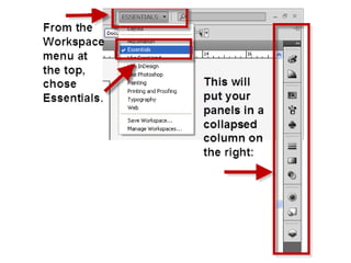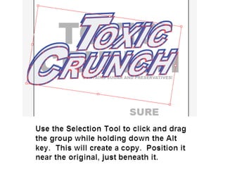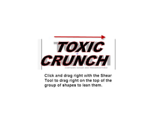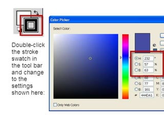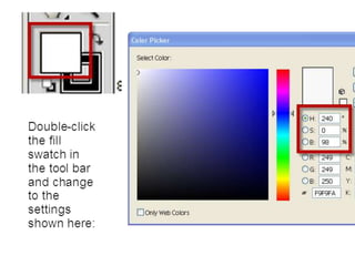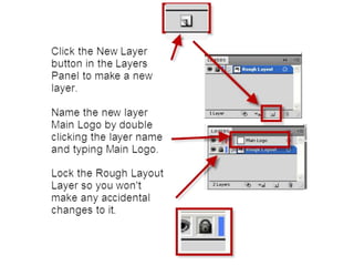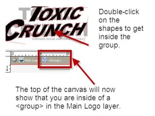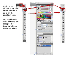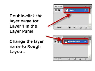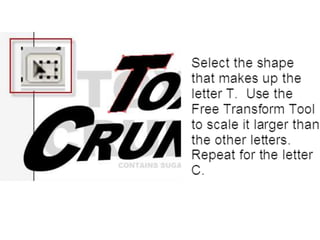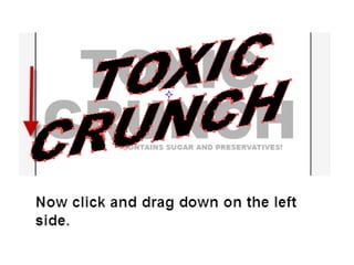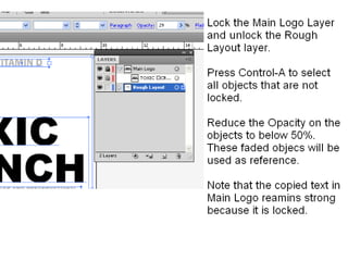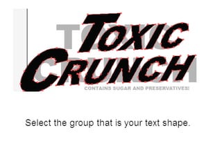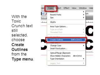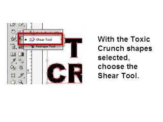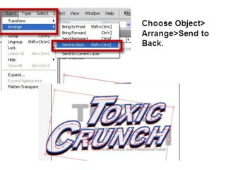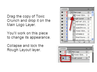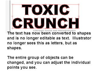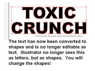 This document discusses adding text to shapes in Illustrator and working with layers and panels. It instructs the reader to open the file from part 1 of the tutorial, use the area type tool to fill shapes with text and type on path. The reader is also told to save their work, export a .png at 600 pixels wide, and create a blog post explaining what they learned and how it applies to designing a cereal box.