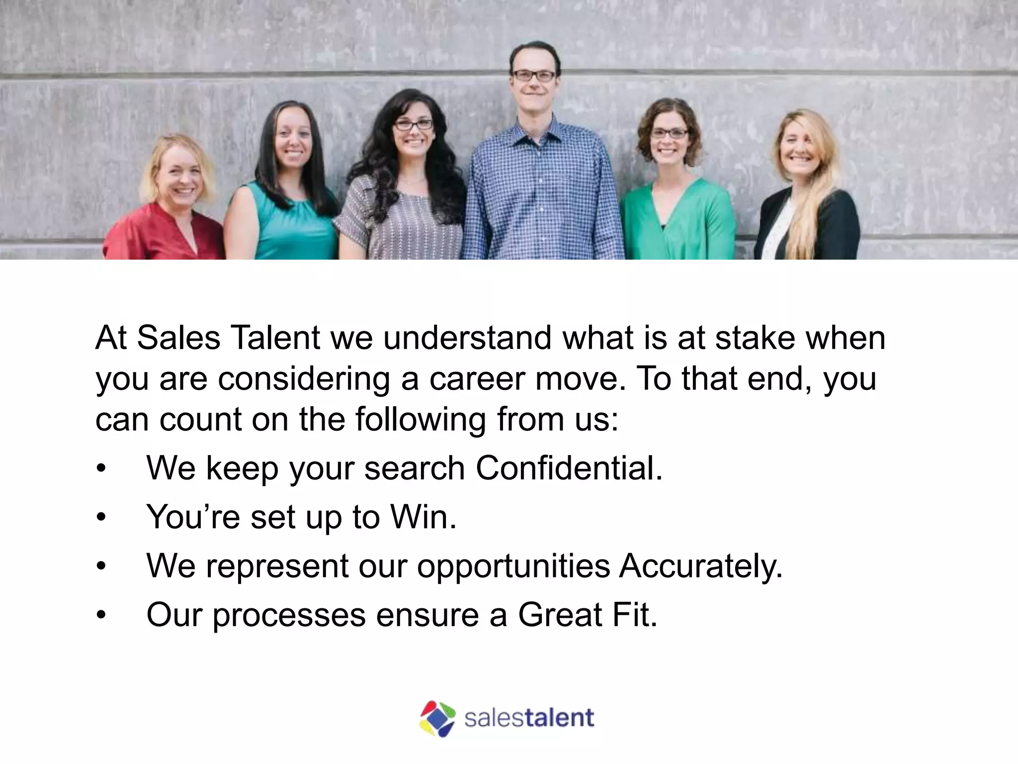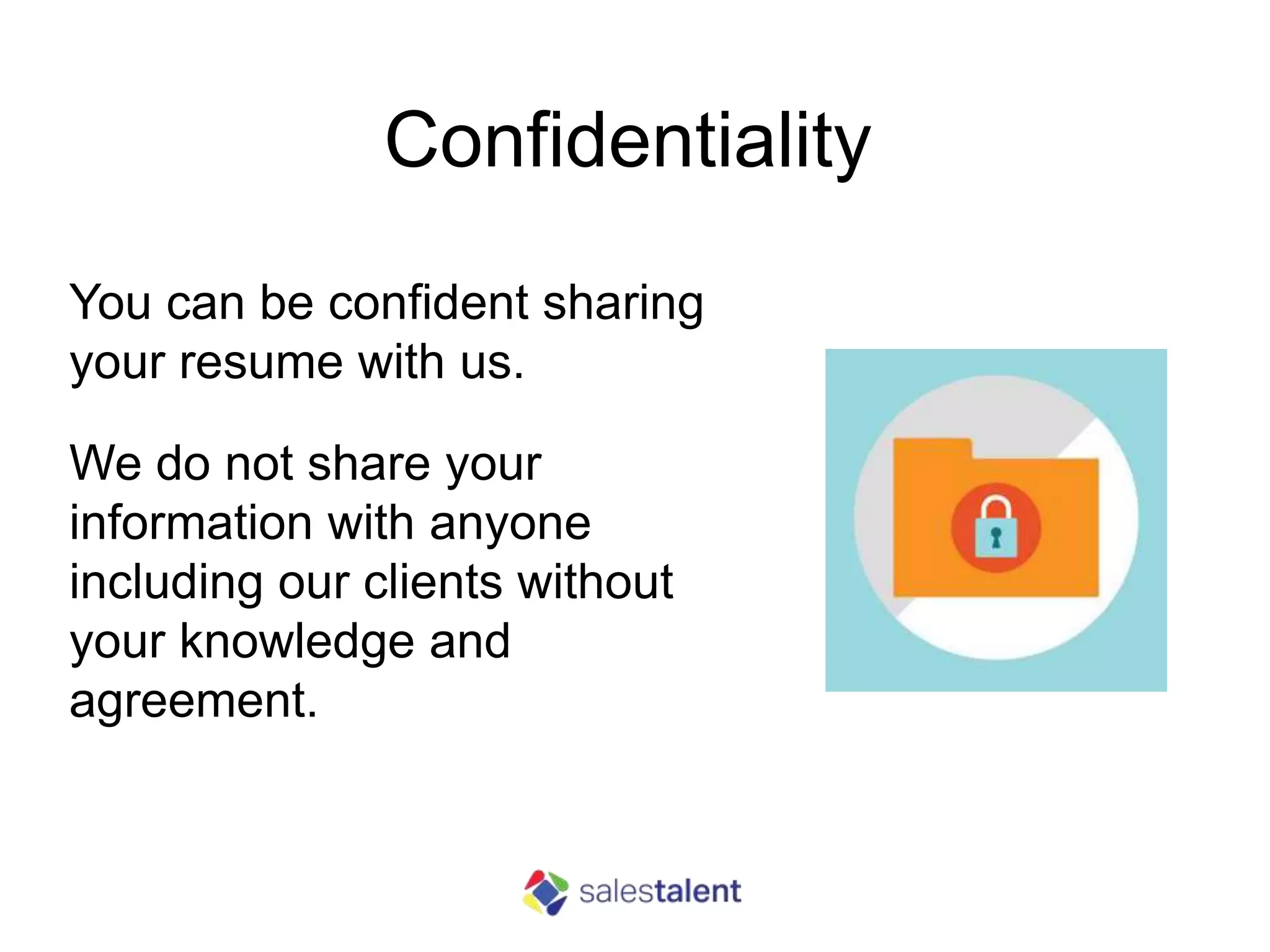 The document outlines what candidates can expect from Sales Talent recruitment agency, including keeping candidates' job searches confidential, setting them up for success, and accurately representing opportunities. Sales Talent ensures confidentiality, only shares candidates' information with their knowledge and agreement, introduces a select few qualified candidates to positions, and believes in a great fit through aligning skills, motivation, culture, career goals with the company's direction while transparently representing opportunities.