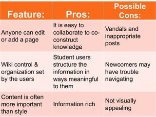 This document discusses using wikis to facilitate collaboration and learning. Wikis allow for easy collaboration as they require no HTML knowledge, pages can be quickly shared and edited, and old versions can be reverted to. Wikis foster learning communities by encouraging cooperation, interaction, and shared goals. They support constructivist learning by allowing students to construct knowledge through active participation and manipulation of content. The document provides examples of how wikis can be structured to support different types of collaborative learning, such as individual student pages linked together or a shared class page. Overall, wikis create opportunities for deeper engagement and knowledge building through collaboration.