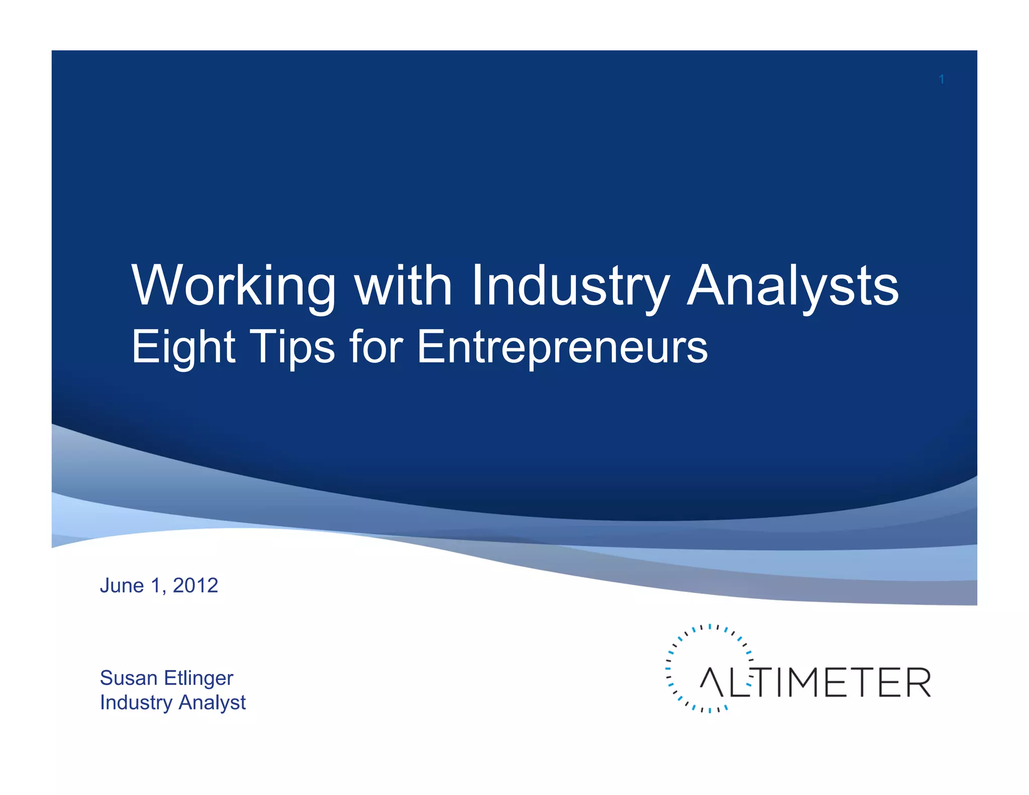 This document provides eight essential tips for entrepreneurs on how to effectively work with industry analysts, emphasizing the importance of understanding their motivations, business models, and service offerings. It highlights the significance of preparation, clear communication during meetings, and maintaining long-term relationships with analysts. Overall, the guidance aims to foster productive engagements that benefit both entrepreneurs and analysts.
