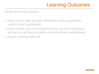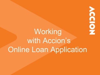 The document provides guidance for using Accion's Online Loan Application, including: