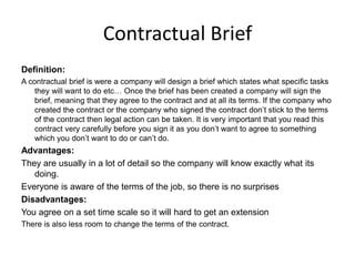 The document discusses different types of briefs that can be used for media projects, including contractual, formal, informal, cooperative, negotiated, commission, tender, competition, and informal briefs. Each brief type is defined and the advantages and disadvantages are outlined. The document also provides examples of how different brief types could be used for a recipe card project.