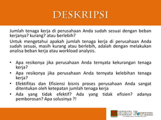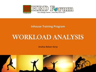 Dokumen ini membahas analisa beban kerja atau workload analysis dalam program pelatihan in-house untuk membantu perusahaan menentukan jumlah tenaga kerja yang ideal. Pelatihan ini dirancang untuk staf, supervisor, dan manajer dari berbagai departemen dengan fokus pada perhitungan beban kerja dan perencanaan sumber daya manusia. Dengan menerapkan analisa beban kerja, perusahaan dapat meningkatkan efisiensi dan efektivitas bisnisnya.