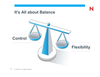 The document discusses intelligent workload management and its importance in balancing control and flexibility across physical, virtual, and cloud environments. It emphasizes the need for security and compliance in managing workloads and provides an overview of the benefits of using WorkloadIQ, including reduced IT costs and increased productivity. The content highlights the transformation of data center computing and the critical role of identity and access management.