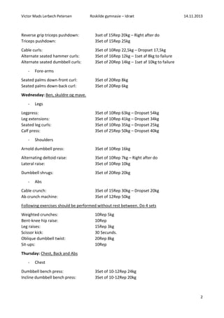 This document outlines Victor Mads Lerbech Petersen's weekly workout schedule. It includes exercises targeting specific muscle groups on different days of the week, including chest and back on Mondays and Thursdays, biceps and triceps on Tuesdays and Fridays, and legs and shoulders on Wednesdays. Most exercises are performed as 3 sets of 10-15 repetitions, sometimes with drop sets, and abs exercises are performed in circuits with minimal rest between sets.