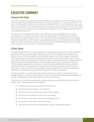 This document summarizes a large study on workplace accountability involving over 40,000 participants. The study found that there is widespread confusion around organizational priorities and lack of personal accountability. Accountability is seen as something that happens when things go wrong, rather than a proactive practice. As a result, organizations struggle with goal alignment, engagement, execution, trust, collaboration and morale. The study suggests accountability is a major opportunity for improving organizational performance if implemented correctly. Leaders play a key role in setting expectations but many are not clearly communicating priorities or holding others accountable.