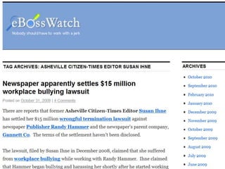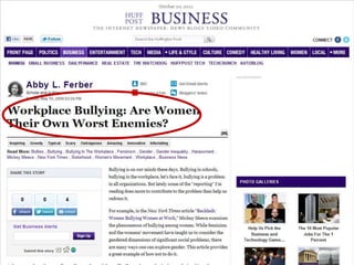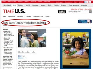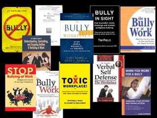 The document discusses workplace bullying, defining it as a persistent pattern of behaviors that threaten and degrade employees, leading to significant emotional and psychological harm. It highlights statistics showing that a considerable portion of the workforce has experienced or witnessed bullying, its detrimental effects on health and workplace productivity, and the economic impact it has on organizations. Additionally, it outlines potential legal frameworks and organizational strategies, such as the Healthy Workplace Bill, to combat bullying in the workplace and emphasizes the need for cultural change to effectively address this issue.