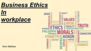 Business ethics in the workplace are the personal and corporate standards of behavior expected of employees. Upholding strong ethics can attract customers, employees, and investors by building trust and a positive reputation. Key components of business ethics include codes of conduct, honesty/integrity, accountability/transparency, and respect. Maintaining ethical behavior, such as dressing appropriately, being on time, accepting responsibility, and avoiding lies, helps foster a respectful workplace culture.