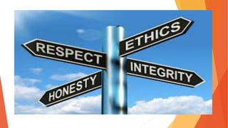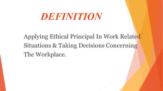 This document discusses ethical issues in the workplace. It defines ethical behavior as applying ethical principles to work-related situations and decisions. Ethical behavior is needed to minimize unethical decisions, legal issues, protect reputation, and ensure efficiency. Factors like individual characteristics, management influence, and organizational culture impact ethical behavior. Common ethical issues include discrimination, harassment, relationships with suppliers/customers, and appropriate use of resources. Guidelines for managing ethics include initiatives from top management, open communication, reporting unethical conduct, codes of conduct, and disciplinary actions. A case study on Satyam Computers highlights the need for codes of conduct, fraud detection, and good governance to address ethical issues.