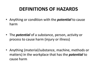 This document defines workplace hazards and provides information on identifying, assessing, and controlling hazards. It discusses the main categories of hazards as safety, health, and environmental. Hazards can be natural, man-made, technological, structural, behavioral, or specific physical, mechanical, chemical, or biological hazards. The key steps for controlling hazards are identification, assessment and evaluation, implementation of controls, and ongoing monitoring and review. Controls include elimination, substitution, isolation, engineering controls, administrative controls, and personal protective equipment. The overall goal is to implement a safety management system to reduce risk and prevent harm from any hazards.