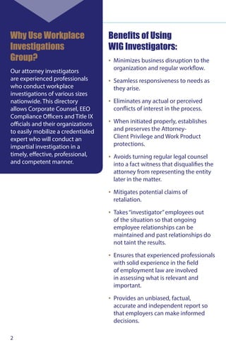 The document is a directory of experienced attorney investigators from the Workplace Investigations Group, providing comprehensive workplace investigation services nationwide. It emphasizes the importance of impartial, professional investigations to mitigate conflicts of interest, minimize business disruption, and preserve attorney-client privilege. The directory includes profiles of various attorneys with extensive backgrounds in employment law and workplace investigations.