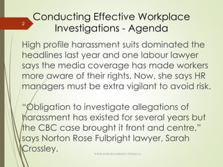 The document discusses the importance of conducting effective workplace investigations, particularly in light of increased employee awareness of harassment rights. It emphasizes the necessity for investigators to be properly trained and impartial to avoid financial and reputational risks for employers. Additionally, it outlines common pitfalls in investigations and stresses the need for procedural fairness and thorough documentation.