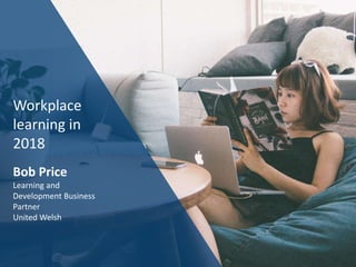 Workplace learning in 2018 focuses on collaborative and social learning opportunities both online and offline. These include MOOCs, virtual classrooms, social media conversations, gaming, mentoring, web series, personal learning networks, projects, case studies, conferences, and missions. Emerging technologies like virtual reality, augmented reality, and artificial intelligence will further transform learning.