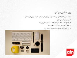 •شخصیتواقعیوحسدرونیافراددرانتخابهایشانازقبیلاشیاوفضاییکهدرانقرارمی،گیرنددخیلمیشوند. •درصورتیکهفرددرانتخابهایشآزادیعملداشته،باشدفضاراسازگارباروحیاتخودمیسازدتادرآنبااحساس بهتروآرامشبیشتریکارکند. •حفظروحیهافراددرمحیطکاربهپیشبردروندکاریکمکمیکندوفضاییشادابوامنبرایکارمندانبهوجودمی آورد. •درنهایتباآگاهیاززبانمیزهاوبررسیهایروانشناختیهرفردبهتنهایی، میتوانبهشخصیتوخلقیاتاواشرافپیداکردتاتعاملیسازندهدرمحیطودر میانکارمندانایجادشود. کار میز شناسی