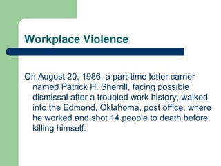 The document discusses various incidents of workplace violence, including notable cases and statistics from different states, highlighting the rarity of sudden violent outbursts and the importance of recognizing warning signs. It outlines risk factors for potential violence, such as history of aggression, substance abuse, and psychiatric issues, as well as the significance of early intervention and threat assessment. The document emphasizes the necessity of a fitness for duty evaluation and options for managing threats in the workplace.
