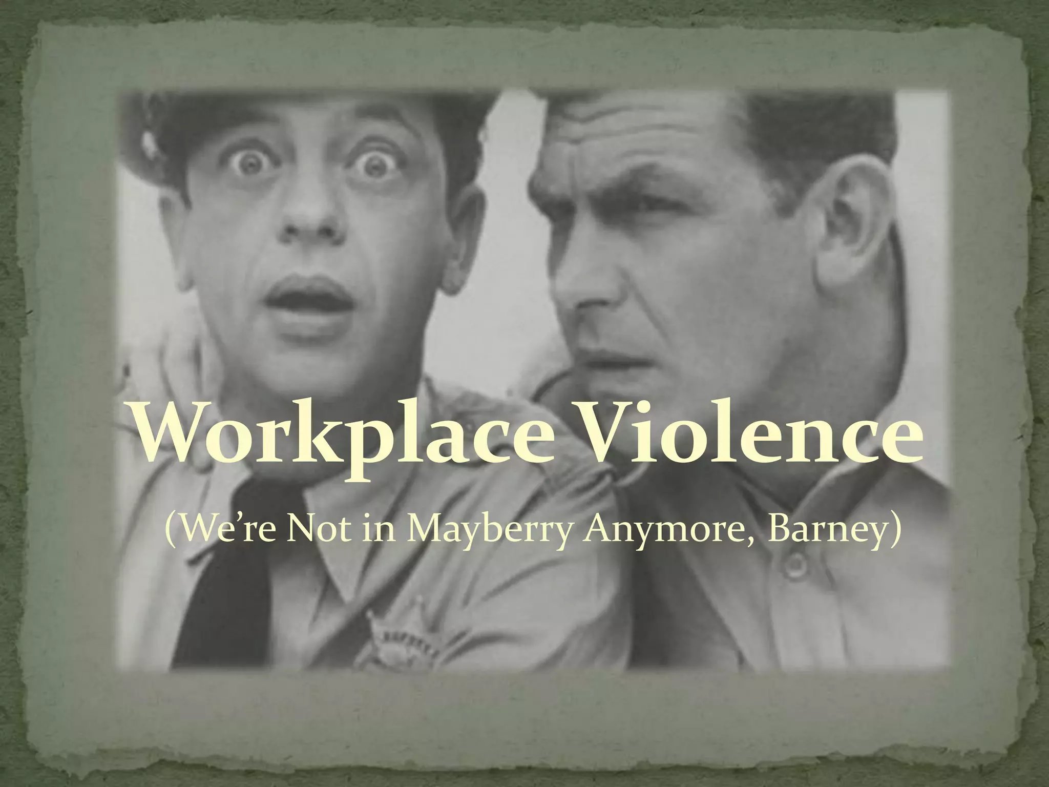 1) It begins by sharing statistics on workplace violence, including that 15-40% of people report abusive or bad behavior at work, and between 1-2 million violent crimes occur annually at US workplaces. 80% are aware of victims and 20% feel daily fear. There were over 600 workplace homicides in 2007.