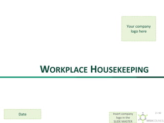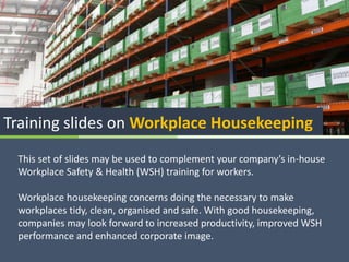 This set of slides provides training on workplace housekeeping. It discusses the importance of good housekeeping for workplace safety, health, and productivity. The 5S approach - Sort, Straighten, Shine, Standardize, and Sustain - is presented as a framework for organizing and cleaning the workplace. Examples of good housekeeping practices in different industries like construction, manufacturing, and healthcare are also shown. The slides can be customized with a company's logo and policies. Checklists and plans for housekeeping inspections and activities are included.