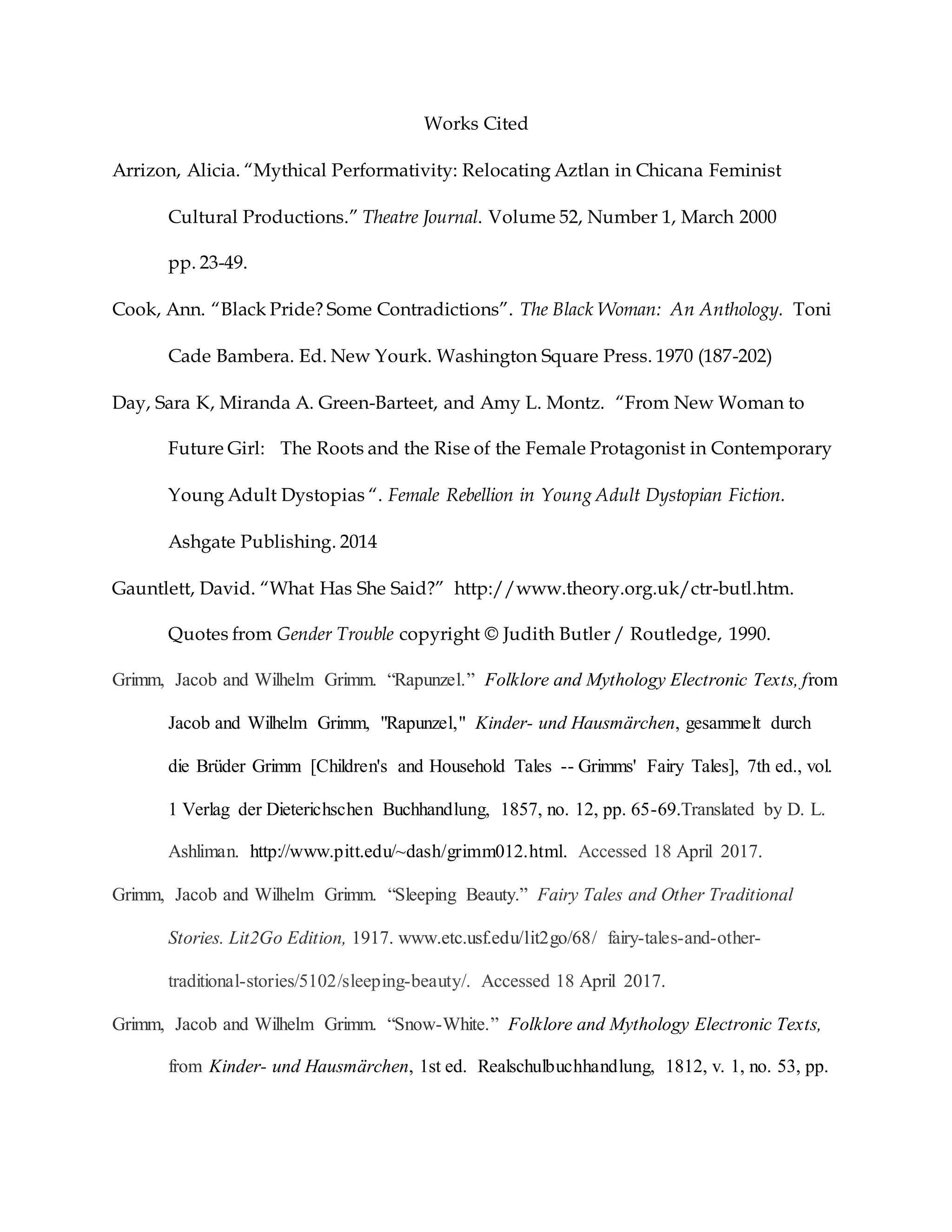 This document contains a works cited list of 16 references used in a paper or research project. The references include books, journal articles, essays, and web pages published between 1970 and 2017 covering topics such as feminist theory, fairy tales, gender studies, civil rights, aging, and patriarchy. The references are listed in APA citation style and include the authors, titles, publication details, and URLs or page ranges for locating each source.